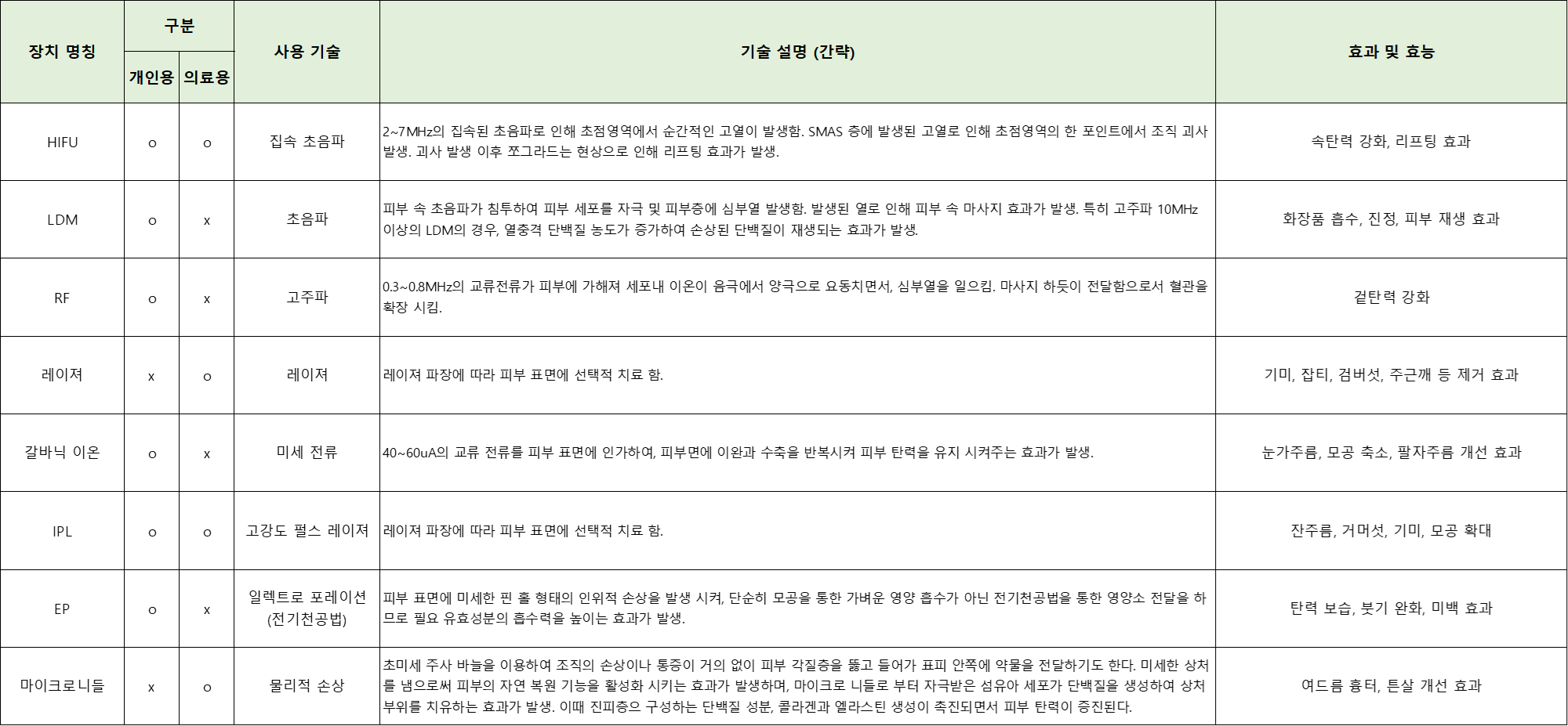 피부미용용도 미용기기 의료기기 (하이푸, LDM, 레이져, RF, 미세전류등) 카테고리 별 시술 효과 및 사용 기술